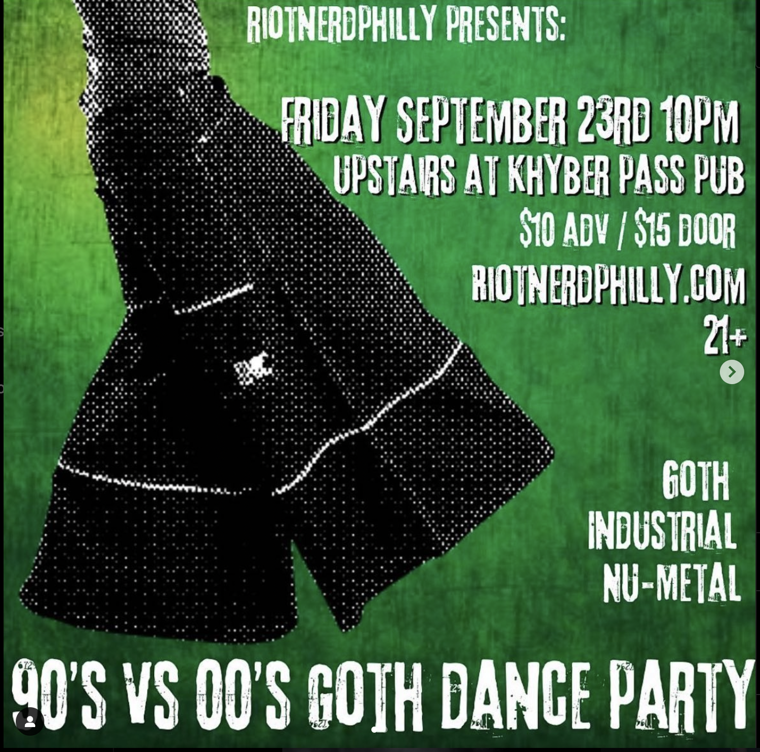 90's Vs. 2000's Goth Dance Party Friday, September 23, 2022 2:05 AM Saturday, September 24, 2022 2:00 AM Khyber Pass Pub 56 South 2nd Street Philadelphia, PA, 19106 United States (map) Google Calendar ICS Tickets Riot Nerd Presents: 90’s Vs. 2000’s Goth at Khyber Pass Pub 9/23